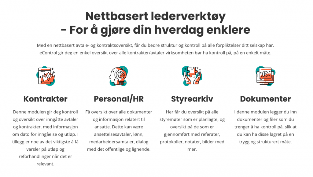 eControl gir deg en enkel oversikt over alle kontrakter/avtaler virksomheten bør ha kontroll på, på en enkelt måte.